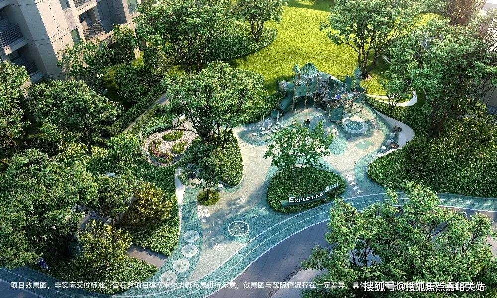 也是一点也不逊色。业主能在归家的动线上体会到不同的景观节点:境隐门开(主入口空间)、悬廊叠瀑(水岸会客厅)、绿野拾趣(儿童乐园)、轻舞晓影(乐享氧吧)、樾下茶庭(宅前花园)、花香漫语(宅前会客花园)、轻氧花园(全龄活动区)。