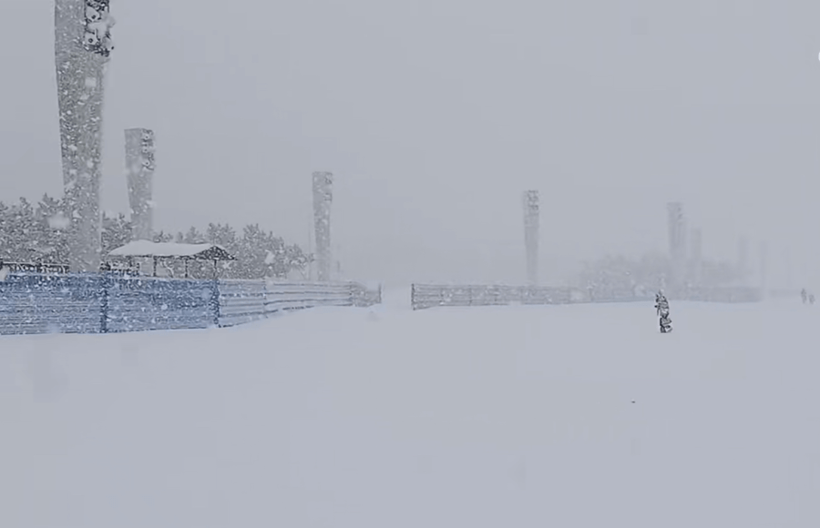 烟台大学东门附近,冷流雪正在狂暴,宛如北极科考。微博网友观云梦雨 视频截图