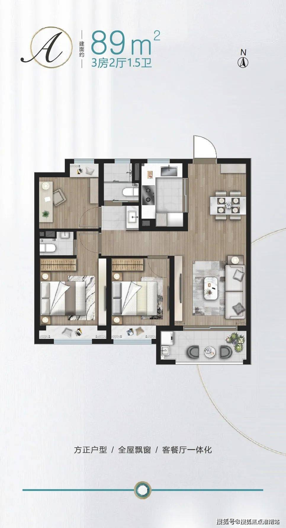 3.5开间的南向户型,除了主次卧朝南,更进一步将客厅的开间加宽,成为一个横厅。横向宽厅的好处是可以有更多的南向采光,阳光更充足。此外,客厅可以弹性软分隔的方式,分出一个开放式书桌的空间,适配更长的家庭周期。